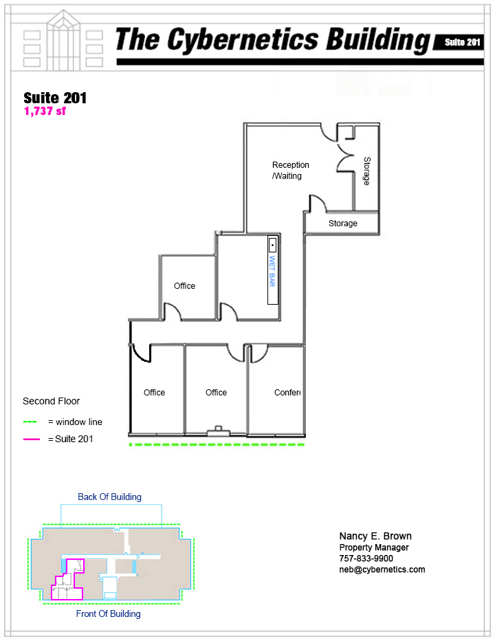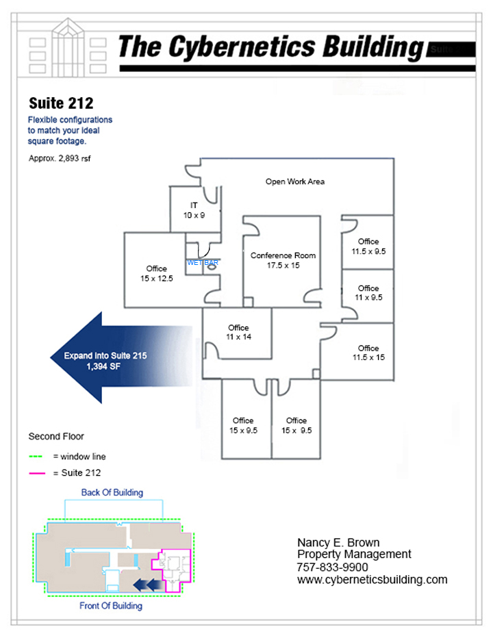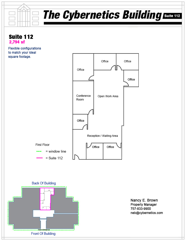 The Cybernetics Building business center, offers several office suite options that provide a diversity of ways people can do business. Great location combined with Class A finishes and the latest technology, makes this facility a unique and ideal setting any business looking to centrally locate their business in the heart of Hampton Roads.